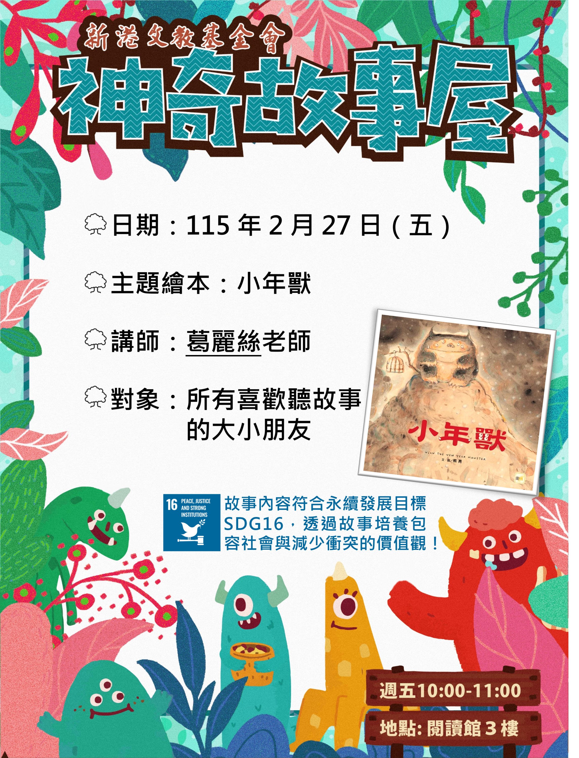 這次神奇故事屋,要跟著葛莉絲老師一起讀繪本大師熊亮的《小年獸》,在故事裡發現農曆新年的由來,學會驅趕害怕,也學會理解與陪伴。