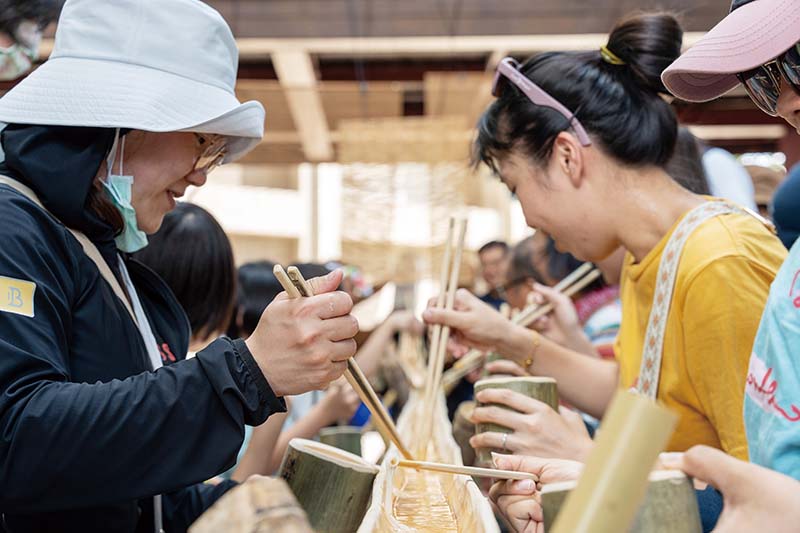 在「流水素麵」的體驗區有個非常醒目的人,她是來自水上鄉的黃雅湄,特別穿著日本和服到場,她感受到主辦單位非常用心,使用飲用水作流水麵用水,活動結束後還贈送一整套由溪口天赦竹編協會竹藝師傅打造竹餐具,而不擅長日文的她也順利地和日本老師自我介紹和交換心得。