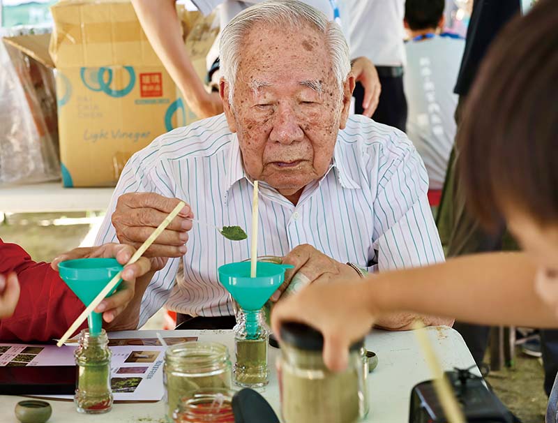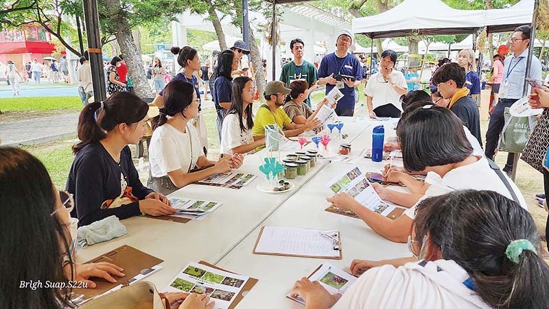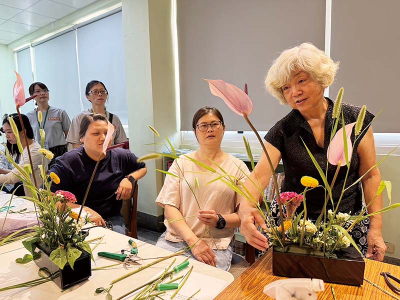 師承日本華道家元池坊的姚蓉嬋講師,在「日本花道」體驗開始時,先請學員和花材對話以培養感情,才能在插花的過程呈現自己的內在思維,好一個藝術的境界呀!講師說若想插一盆賞心悅目的花,其實很多的花材在生活周遭是唾手可得的;千里迢迢來到新港的飛驒貴賓讓我們體驗藥草做成「七味粉」和「藥草茶」,講師也告訴我們那些藥材在當地野外土生土長且俯拾即是。