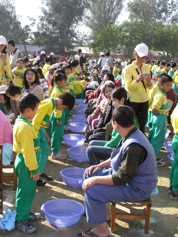 典禮開始了,孝行典範---林昭元董事長全家也來到會場。一千二百多名學生,六百多位家長,手拉著手走進操場,在頒獎感謝捐資興學者後,千人洗腳報親恩活動正式展開。嚴校長親身示範幫媽媽洗腳,林董事長、林奶奶和長子也就位,由兒孫來幫忙服務,老中青三代齊聚,意義非凡,家長群中也不乏這樣全家齊聚的場面。