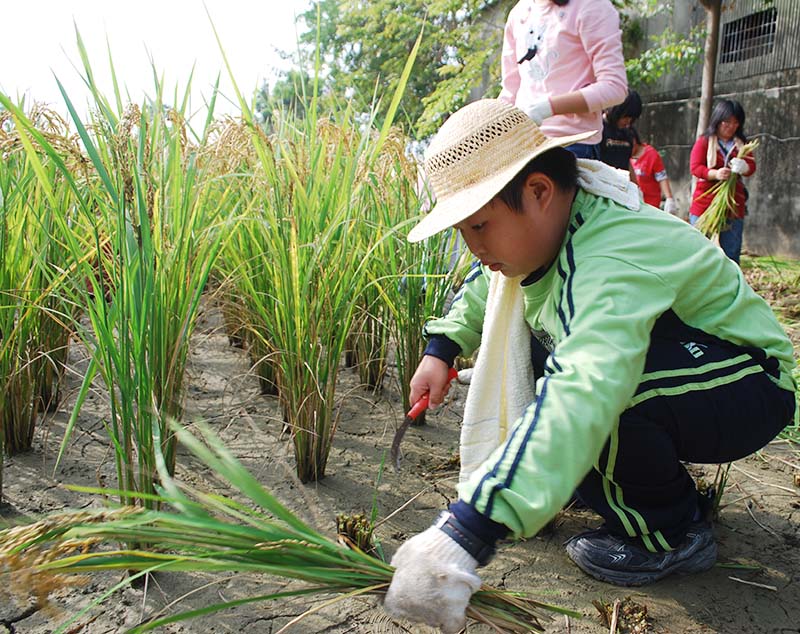 「四十分鐘農夫」對我來說算是小case,因為在爸爸的菜田裡,我每次要待一小時以上。當我抓起稻梗的時候,就覺得手臂癢,我不怎麼喜歡這種滋味;不過在我家田裡割草的本領,讓我可以展現在割稻的工作上,我很開心!(郭昱佑)