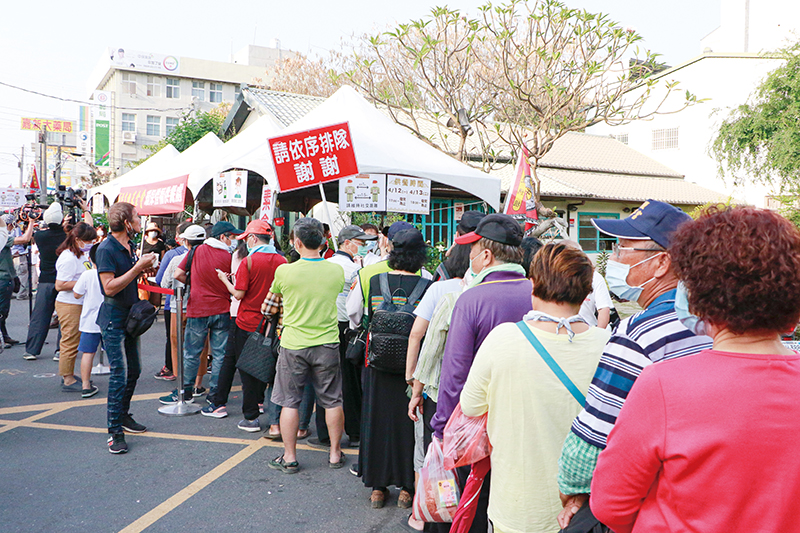 基金會自102年成立的環保惜福供餐處,在去年受到疫情波及,暫停以往環保供餐方式,改以發放來自鄉內優良商家的熟食。今年基金會在防疫優先考量下,仍然採用去年的方式,供應素食飯糰、水煎包、芋粿巧,讓遠道而來的香客得以健康安全,舒適溫飽。同時,提倡防疫觀念,敦請香客帶好口罩,保持社交距離,環保惜福供餐處的排隊人龍,也有本會義工協助香客進行額溫測量及酒精消毒,更感謝新港衛生所提供自動酒精洗手機,鼓勵香客勤洗手,落實防疫措施。