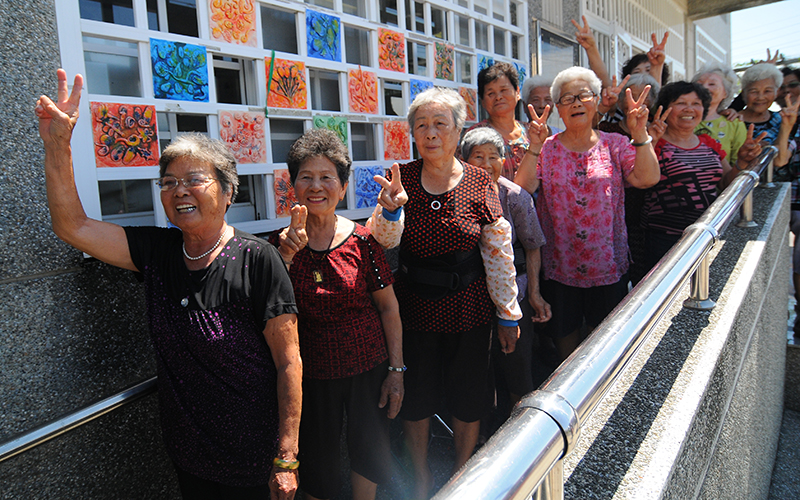 當48件小型浮雕作品,裝置在活動中心的外窗,成為獨一無二的美麗窗花,對映去年創作,仍繼續在活動中心外晚上亮起的燈,阿嬤們露出花樣燦爛的笑容!