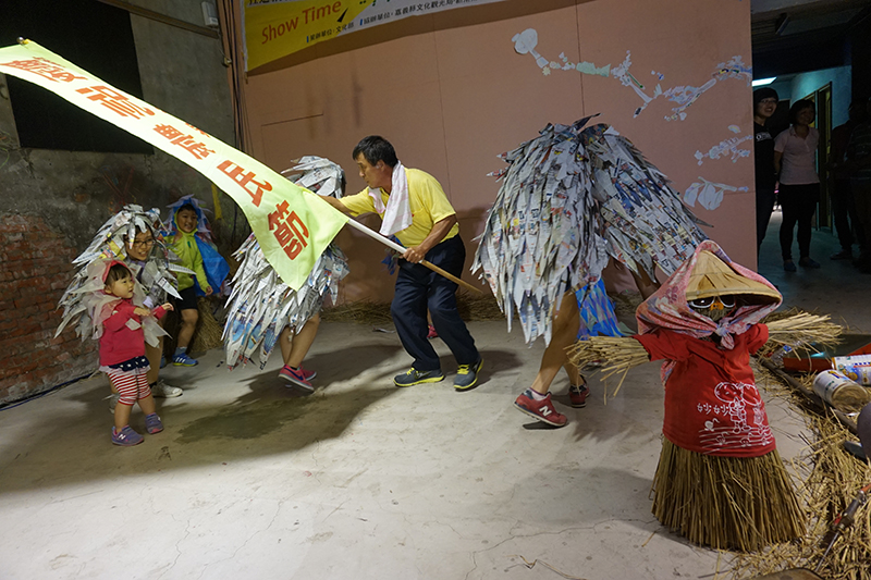 欣賞這些多采多姿的畫面:演出前一夜加工紮綁的稻草人,報紙、塑膠袋裁剪而成的麻雀裝,農作的器具,每一樣都來自生活、來自雙手,包括他們的故事、歌唱和信仰。