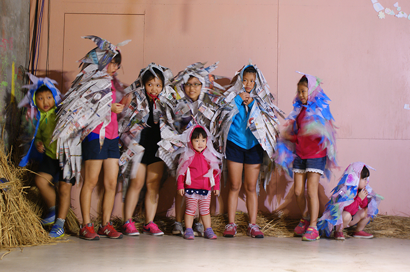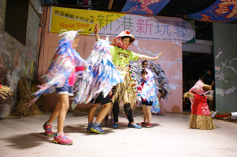 今年再度參加新港新玩藝,感覺我們這群人的歌藝、舞藝及創意都更精進了,日常生活中大家各忙各的,學生族、上班族、田園農夫族,還有顧厝顧孫的銀髮族,更有最吸「睛」的可愛族─娜娜、妮妮,都在妙班長的一聲號召下全體動員,各個展現出最亮眼的一面。當然還有聲動樂團Mia老師的專業指導,練歌喉的、練琴藝的、想點子的、背台詞的、做道具的,讓我們使出渾身解術。