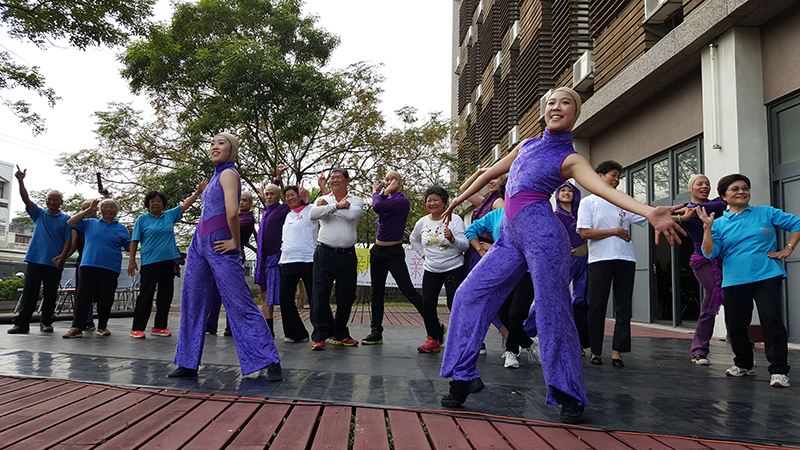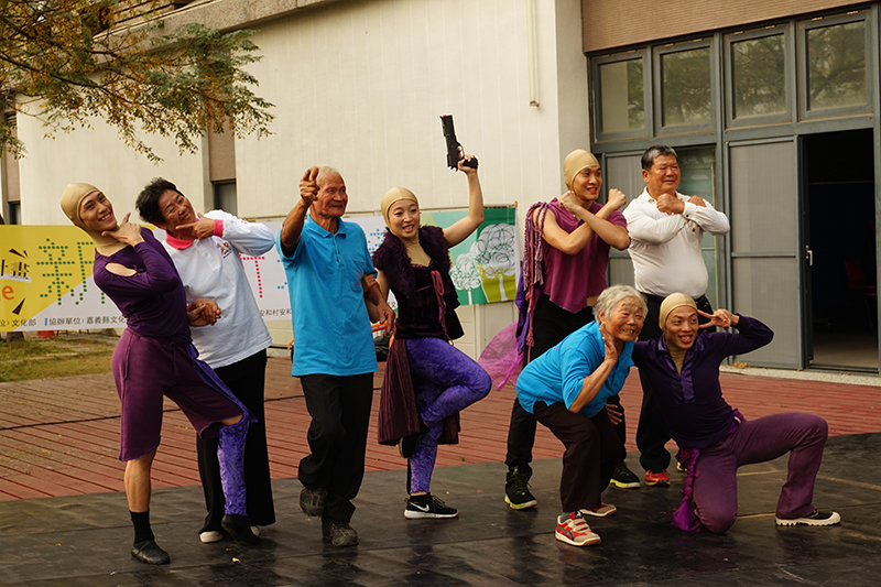 十二月五日,我帶領著古民村、月眉村及月潭村五十幾位阿公、阿嬤們,在國立新港藝術高中展現過去八週來上課的成果,我們沒有特別的排練,只是將上課的過程分享給大家,透過肢體的活動跟身體的關節肌肉相互交流對話,喚醒身體的動能,在呈現的當下,阿公阿嬤們專注的眼神,認真的跟自己身體工作的模樣,真是美麗!他們雖沒年輕人的動能,但在手舞足動間,那分圓融是時間跟歲月所累積的美感。