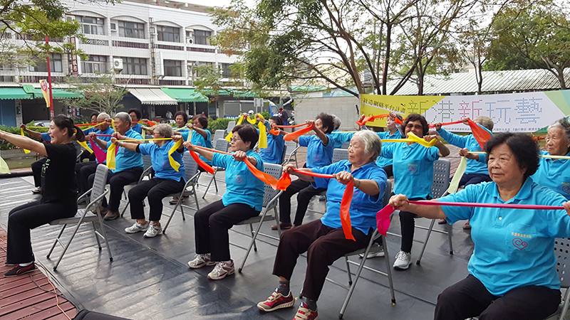 由文化部「推展社造創新活力網絡計畫」補助的「新港新玩藝─社造網絡平台計畫」,月眉潭與古民社區的「生活律動 - 肢體開發」工作坊成果發表會,於12月5日,在新港藝術高中熱鬧登場。超過50位的阿公阿嬤們,隨著音樂節奏,輕鬆做運動。「三十舞蹈劇場」,也帶來《運動場》《傷患慶典》和《伸展台》等三支精采舞碼。
