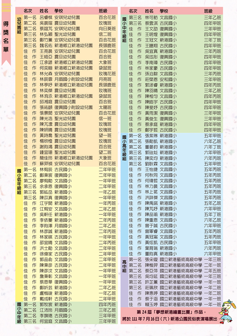 由新的世代創作下一個「音樂狂歡節」,張采璇同學設計思維新穎,結合流行時事,人、事、物造型設計細膩,畫面呈現熱鬧的場景。蔡亞萍同學運用粉紅色調為主,利用曲線、弧線造型,設計出食物擬人化的手法,並且掌握整體美感,運用不透明水彩的處理方式,主題表現明確。陳楷羿同學藉由橙黃與藍補色的對比,色彩畫面強烈,演唱人物享受在音樂的歡樂氣氛。