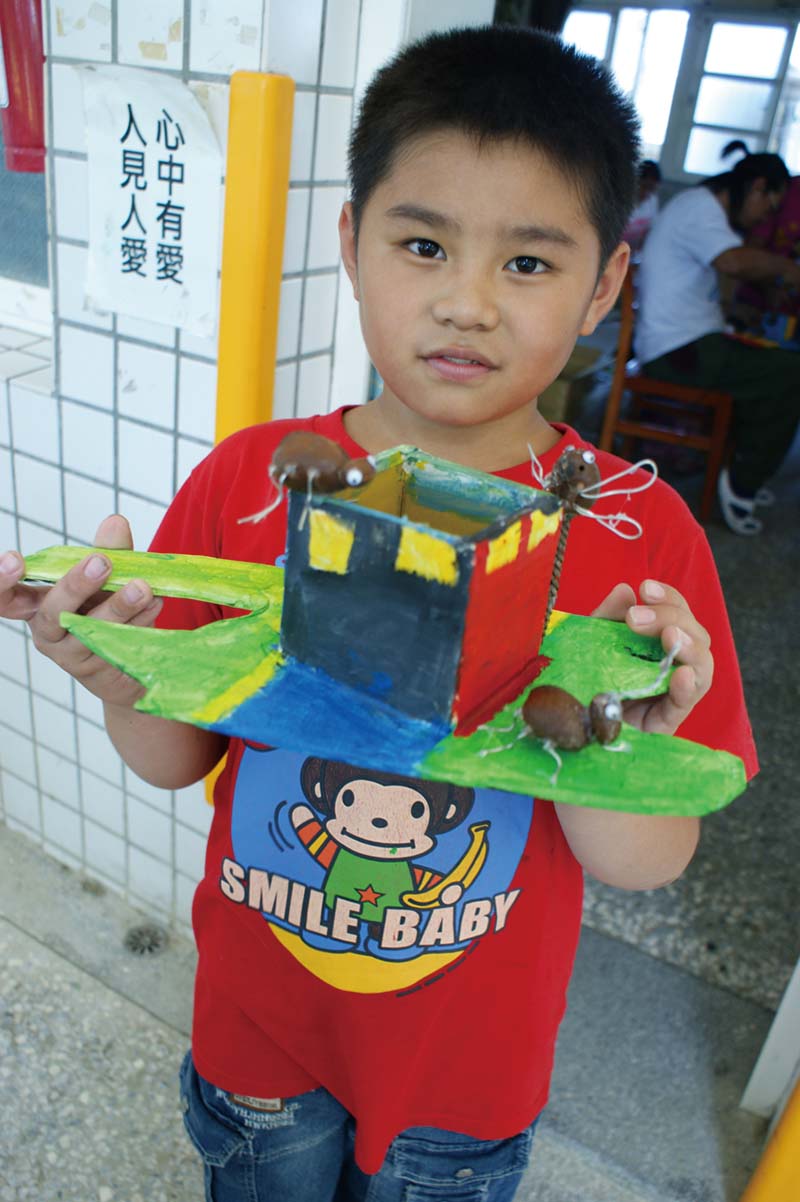 第二場緊接著安和國小,邀請嘉義在地藝術家蔡恭和老師前來授課,此場課程內容分為兩種不同的作品來呈現,第一個作品運用了回收的寶特瓶罐子與海邊所撿的大貝殼,加上校園內一棵棵大樹上所掉落下來的天然材料,製作了一支可愛又具有獨特風格的貓頭鷹,另一個作品採用切割的木板加上海邊所撿來的貝殼及天然材料的結合,製作了實用的名片架。