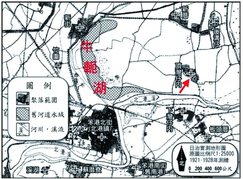日治時期製圖水準已精進許多,具備現代科學測量基礎,從日治初期1904年的「臺灣堡圖」到中期1921年「臺灣實測地形圖」(此兩幅地圖已經幾何校正,圖幅範圍相同,圖內的十字標「+」在二幅圖內的相對位置都一樣),亦可看出原同位於笨港溪(北港溪)曲流南岸聚落的頂灣仔內、下灣仔內,因溪流不斷的侵蝕沖刷改道,經過河流截彎取直後,除明顯遺留舊河道的「牛軛湖」外,隨著頂灣仔內往東北遷移,兩地已分隔南北岸了,以致於頂灣仔內後來行政區改隸屬於雲林縣北港鎮,而下灣仔內則歸屬嘉義縣新港鄉。下灣仔內聚落跌宕的變遷,似乎沒有因此而嘎止,日後的「八七水災」、「八一水災」又再度讓它重創遷移。