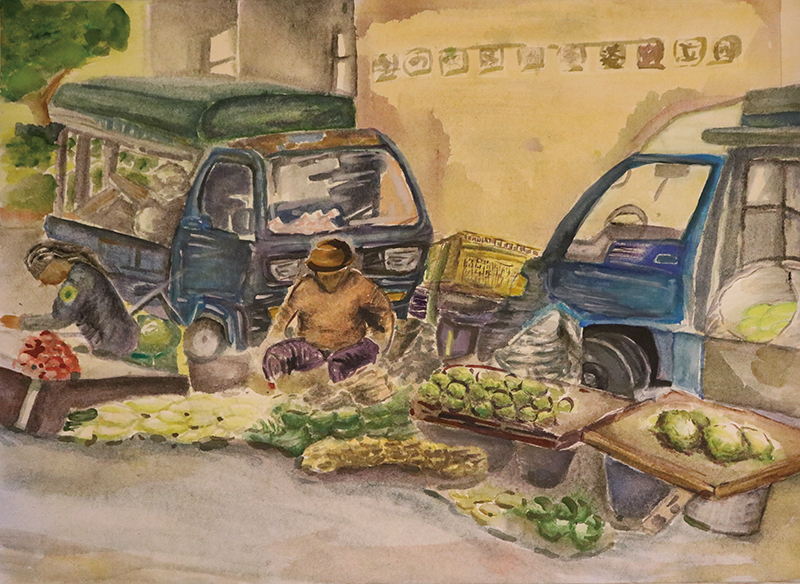 楊立暘同學透明水彩表現農村,取景在市集裡面,從路邊就可以看得出來很熱鬧;用素描的方式在畫,追求素描的效果,很扎實。陳易楷同學的畫面乾淨不瑣碎,透明水彩的呈現,描述得很好,街景配合同步表現。林嘉瑋同學的作品,以「記憶」為美的風景,色彩構圖很搶眼,技法很好,顏色鮮豔,去年的活動,讓人記憶是很鮮明且深刻的,內心留下最美的風景。