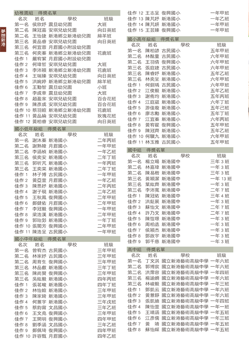幼兒園組的整體作品,充滿著兒童的純真、可愛,在色彩運用上也較為繽紛活潑,孩子的感覺很靈敏,展現在新港生活的繽紛與熱鬧。